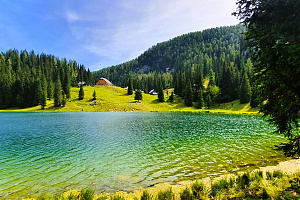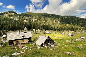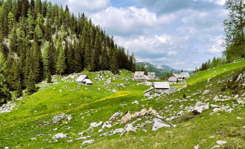 A túra legmagasabb pontját közel 1700 méteren érjük el. Pihenünk egyet és elkezdünk leereszkedni. Az ösvény innen vadregényesebb arcát mutatja: fenyvesek és jellegzetes karsztformák váltják egymást. Tipikus alpesi karsztterületen haladunk, ahol a víz által formált mélyedések és üregek emlékeztetnek arra, hogy a Júliai-Alpok nemcsak csúcsokból, hanem rejtett föld alatti világokból is áll. A nap egyik legszebb pontja a Koča na Planini pri Jezeru. A menedékház egy mesébe illő alpesi réten, mintegy 1450 méteren áll, mellette kis tó, körülötte fenyvesek és legelősző állatok – igazi alpesi képeslap-hangulat vár ránk. Itt megállunk pihenni és harapni valamit. A Vodični vrh csúcsát megkerülve ereszkedünk vissza a völgybe. Innen autóval megyünk vissza a szállásunkra, és a mai napot is közös beszélgetéssel, vacsorával koronázzuk meg.